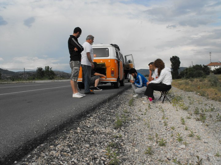 Öğlen vakti buradan hareket ettik. Sonra Özer abi’den olumsuz bir haber geldi. Maalesef kendisi yolda kaldı ve yollarımızı bu noktada ayırmak zorunda kaldık. Problemi büyüktü, radyatör hortumu patlayınca motor kısa sürede onarılmaz derecede hasarla karşılaşmıştı. Yola devam ettik ve Çakallı’da menemen molası verdiğimizde Yücel abiler de bizleri yakalamıştı. Bu noktaya yakın bir yerde de Teneke’nin çektiği Caretta’nın lastiği iki kez patlayınca onlar da ana ekipten biraz geride kalmışlardı. Ama nihayetinde herkes Çakallı – Asmaaltı Menemencisi’nde buluştuk… Menemenler çok lezizdi ve tabak tabak yedik. Özelliği kabuğu soyulmuş domatesin bütün halinde menemenin içine atılması, erimeyen kısmın çöpe geri yollanması ve de en son üzerine kaşar rendelenmesiymiş…