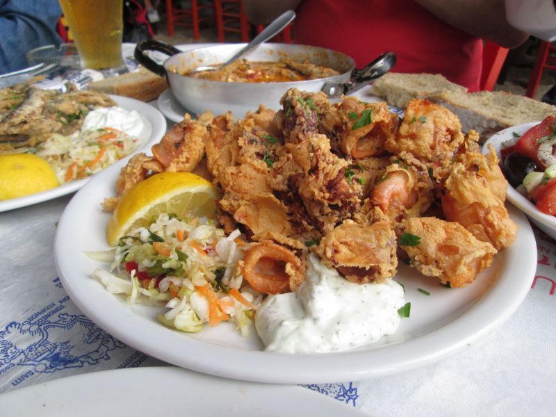 Selanik’teki birçok tavernanın menüsünde hemen hemen aynı mezeler bulunuyor. Kendi özel lezzetleri de elbette mevcut. Porsiyonlar Türkiye ile kıyaslanmayacak derecede büyük. Tek meze, ana yemek gibi doyurabilir insanı. Kalamar tabağında en az on, on iki halka kalamar, hem de iri kesilmiş vaziyette önünüze geliyor. Bir de ayaklarıyla birlikte! Kabak kızartmasını birçok mekân önce una bulayıp öyle kızartıyor. Böyle olunca da hem kabak çok yağ çekmemiş oluyor, hem de çıtır çıtır yenebiliyor. Cacık bizdeki gibi sulu değil. Genellikle süzme yoğurt içerisine, iri kesilmiş salatalıklar ile servis ediliyor. Patates kızartması söylediğimiz bütün mekânlar elde doğranmış patatesleri masamıza getirdi, dondurulmuş patatesleri değil. Aynı şekilde uğradığımız tüm tavernalarda masamıza konan ekmekler de hazır ekmekten ziyade el yapımı ekmeklerdi. Yunan salatası her masanın olmazsa olması. Domates, salatalık, soğan, biber, kalamata zeytin, beyaz peynir iri iri doğranıp masaya getiriliyor. İçerisindeki kekik ve bol zeytinyağı ile yazın en güzel serinleticisi oluyor bu salata. Bu gezi boyunca masamızdan eksik etmediğimiz bir diğer lezzet de midye dolmaydı. Aslında midyeli pilav veya pilavlı midye demek daha doğru olur. Sağ olsun ülkemizde hazırlanan bol baharatlı midyelere alıştığımızdan, masamıza gelen midyelere önce şaşırsak da favori mezelerimiz arasına düşünmeden koyduk. Zira bir yemekte tatların baskınlığını önlemek elinizdedir. Dereotunun, pirincin, midyenin hatta kapya biberin tadını alabildiğim midyeli pilav, insana parmak yedirtir!